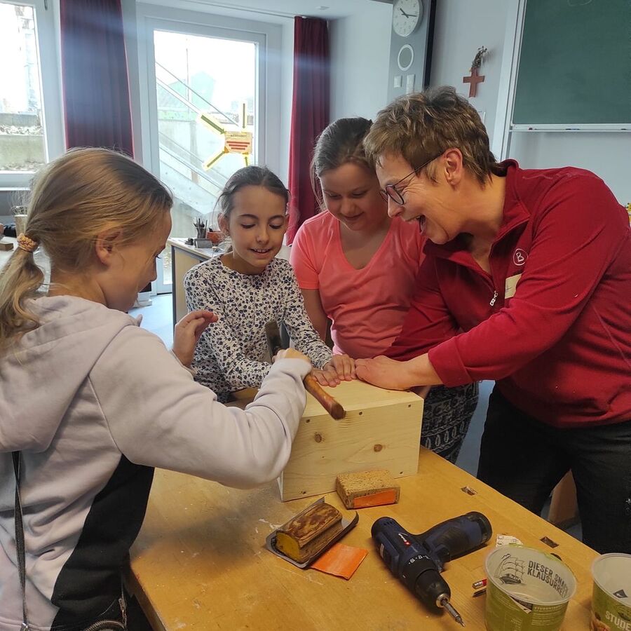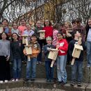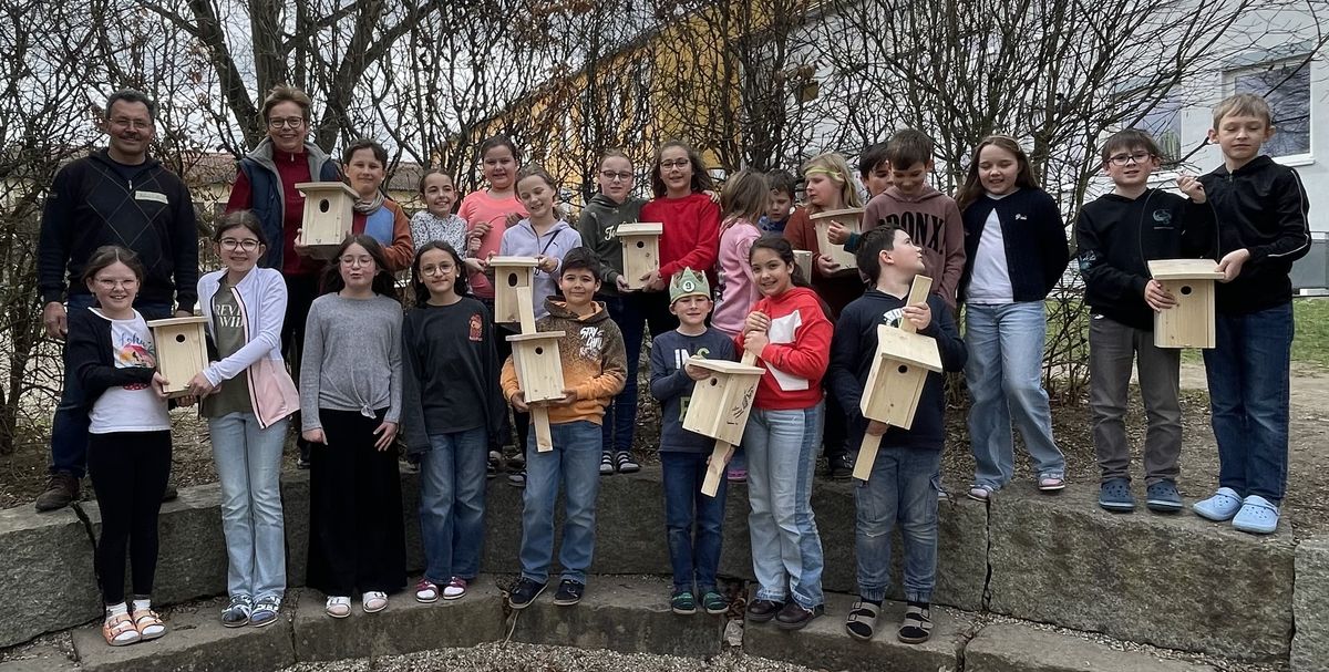 Aber apropos hoch hinaus- als Umweltschule in Europa setzt die Grundschule jährlich zwei Projekte um. Ein Teilprojekt konnte in den letzten Tagen vor den Ferien mit der tatkräftigen Unterstützung des Gartenbauvereins, der dankenswerterweise auch die Kosten für das Material übernahm, fertig gestellt werden. Mit Birgit Ertl, Lothar Hafner und Siegfried Ketterl entstanden mit kleinen und großen Händen 10 Nistkästen, die nun rund um die Schule- und gerade noch rechtzeitig- seit letztem Samstag in luftiger Höhe zum Erstbezug einladen.