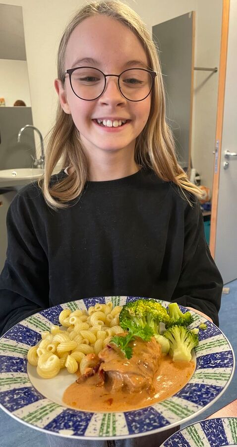 Immer montags um 12.15 Uhr geht es in der kleinen Schulküche hoch her, damit pünktlich um 13.00 Uhr gegessen werden kann. Und was noch wichtig ist, es bleibt nichts übrig und der achtsame Umgang mit Lebensmitteln- Was ist noch da? Was muss nächste Woche verarbeitet werden? - wird gelebt und bleibt hoffentlich weiter eine feste Einrichtung an der Schule.