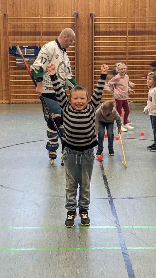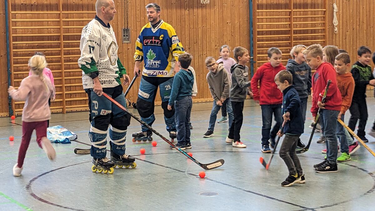 Am 28. November 2025 war es wieder so weit: Mit Martin Eckart und Alexander Dorn kamen zwei Urgesteine des Indoorhockeyvereins „Deggendorf Pflanz“ zu uns an die Schule, um die Kinder für ihren Sport zu begeistern und für neue Nachwuchsspieler zu werben. Nachdem die beiden, die sowohl aktive Spieler als auch Trainer im Verein sind, die wichtigsten Trainingsausrüstungen erklärt hatten, ging es in die Praxis. Sie führten den Kindern einige technische Spielzüge und gegenseitige Angriffe vor, wobei auch einige Tore fielen. Die Kinder waren mit Feuereifer bei der Sache und spornten die beiden Kontrahenten lautstark an. Am Ende der Trainingsstunde bekam jedes Kind dann selbst den Hockeyschläger in die Hand und durfte einen Schuss auf das Tor absolvieren. Die unzähligen Tore, die dabei erzielt wurden, ließen auf viele, bisher noch schlummernde Talente in dieser Sportart schließen.